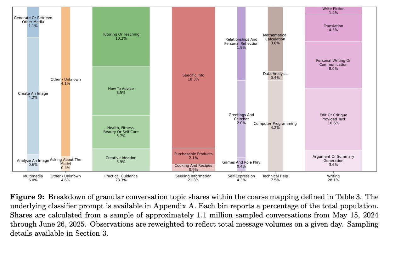Despite significant media focus, computer programming represents a relatively small share of use, at only 4.2% of messages.